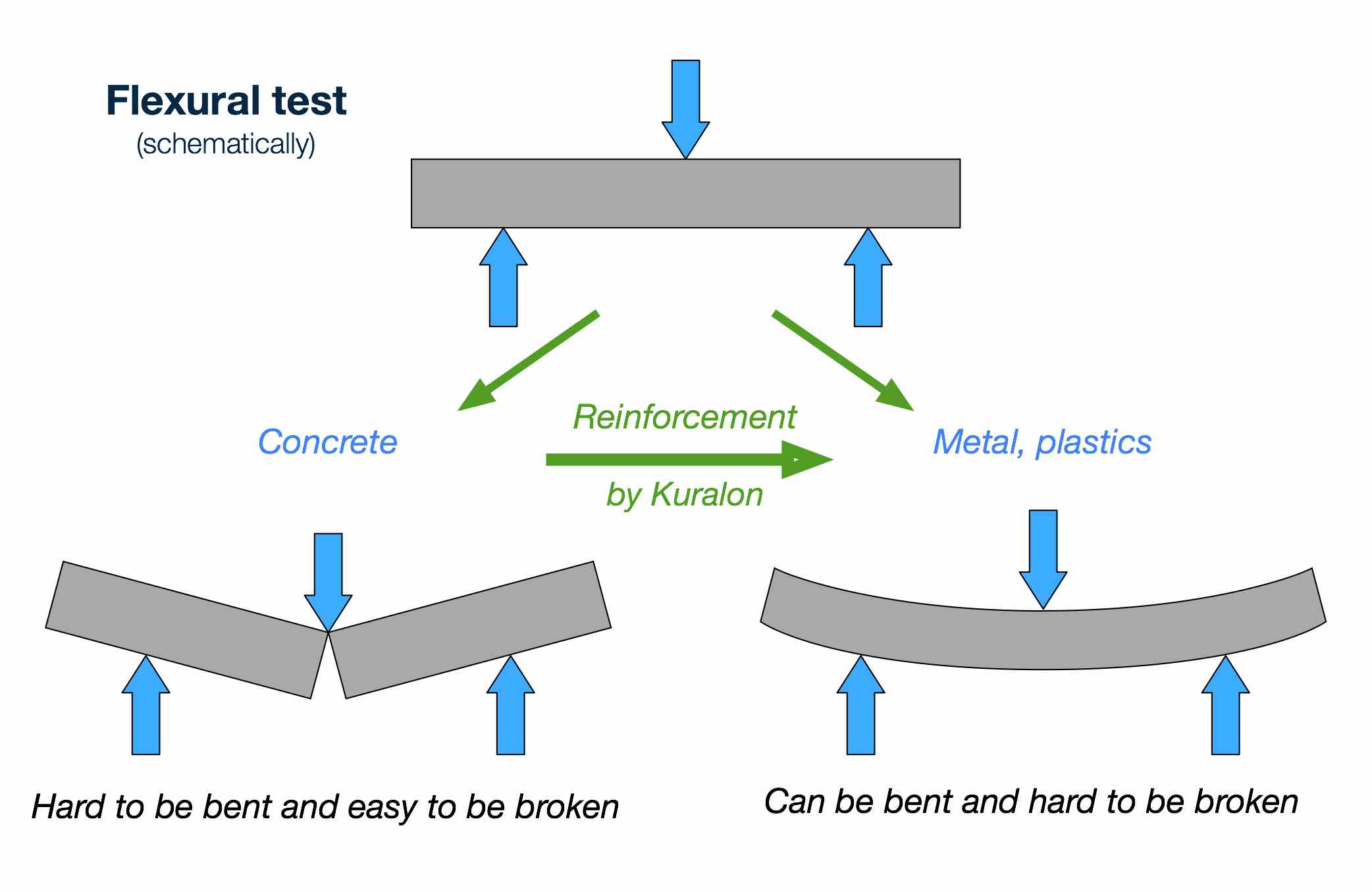 KURALONTM hecht uitstekend aan de betonmatrix worden en kan een brug vormen tussen de binnenoppervlakken van scheuren. KURALONTM voorkomt dat scheuren breder worden waardoor betonnen elementen meer gebogen kunnen worden zonder te breken.